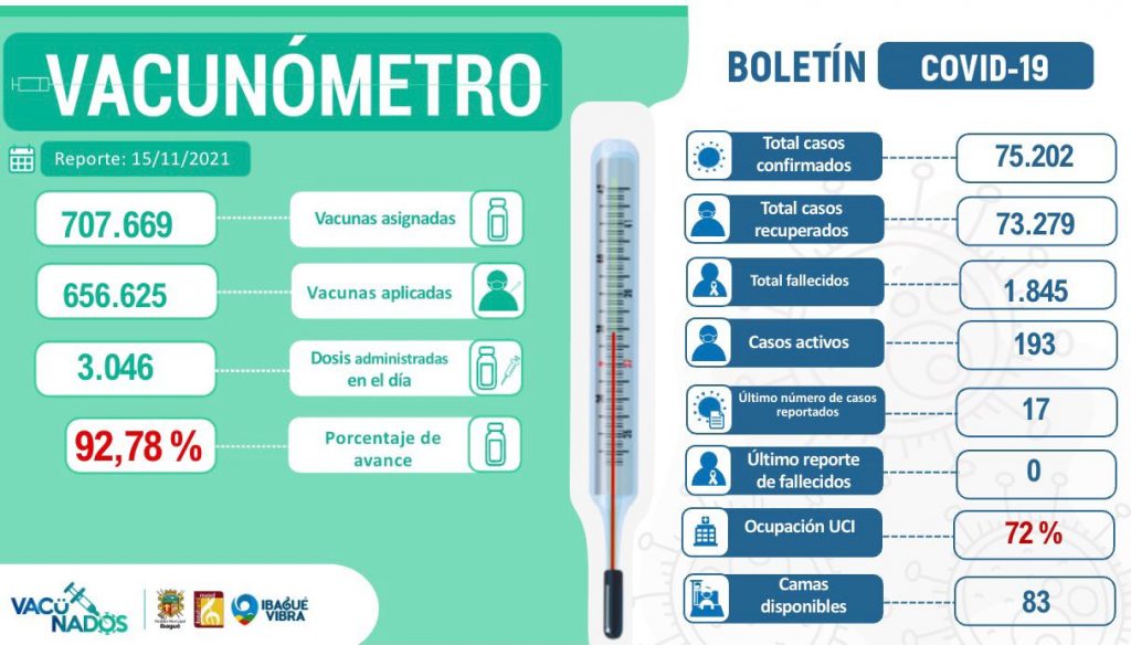 El Instituto Nacional de Salud informó que Ibagué llegó a los 75.202 contagios por Covid-19, pues hasta el domingo 14 de noviembre de 2021, se reportan 17 nuevos pacientes. Se trata de 11 mujeres y seis hombres, entre los seis y 60 años. De esta misma manera, la entidad dio a conocer que hasta el momento no se registraron fallecimientos.