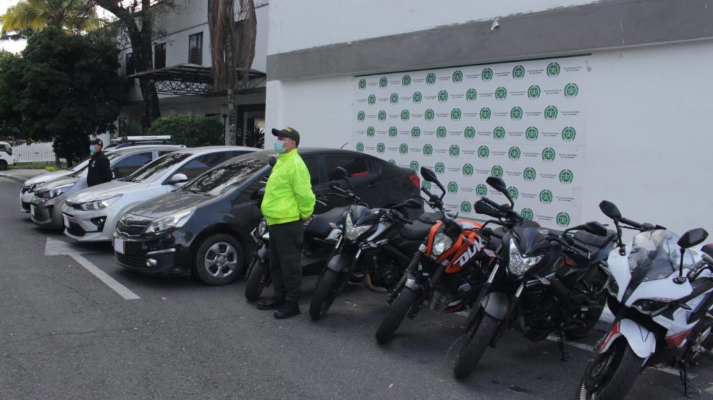 “En tan solo 72 horas se inmovilizan cuatro vehículos hurtados y cinco motocicletas. Todo este parque automotor había sido robado en ciudades como Bogotá, Cali, Barrancabermeja y municipios como Madrid, Cundinamarca y Envigado, a través de la modalidad de halado y en atracos a mano armada con varias víctimas”, dijo el general Fernando Murillo Orrego, director de Investigación Criminal e Interpol de la Policía Nacional.