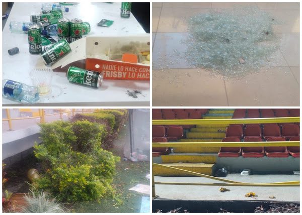 De esta manera en las fotografías compartidas por el club se puede ver el desorden que dejaron los visitantes en el camerino norte del Murillo Toro, con residuos de comida, latas de cerveza y botellas de licor; cuando se conoce que estas botellas son de un ingreso PROHIBIDO además del daño en las barandas de la localidad de Occidental, por los seguidores infiltrados que, además de irrespetar la prohibición en su ingreso, causaron daños en este sector del estadio.
