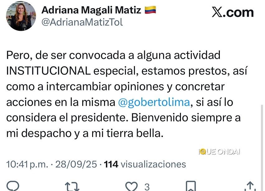 La gobernadora del Tolima, Adriana Magali Matiz, confirmó, a través de su cuenta en la Red Social X, que el próximo viernes, 3 de octubre, cumplirá una agenda, previamente establecida, en el municipio de Chaparral.