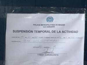 El funcionario, añadió que el establecimiento fue suspendido por 10 días, de acuerdo con lo establecido por la normatividad vigente, y recalcó que este tipo de acciones buscan mantener el orden y la seguridad en la capital tolimense.