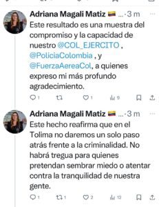 Inicialmente, Adriana Matiz resaltó y agradeció la respuesta operacional de las autoridades: “Este resultado es una muestra del compromiso y la capacidad de nuestro @COL_EJERCITO , @PoliciaColombia , y @FuerzaAereaCol, a quienes expreso mi más profundo agradecimiento”.