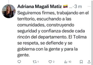 Seguidamente, la mandataria reiteró su compromiso con la tranquilidad y seguridad de los tolimenses. “Seguiremos firmes, trabajando en el territorio, escuchando a las comunidades, construyendo seguridad y confianza desde cada rincón del departamento. El Tolima se respeta, se defiende y se gobierna con la gente y para la gente”, escribió en otro trino.