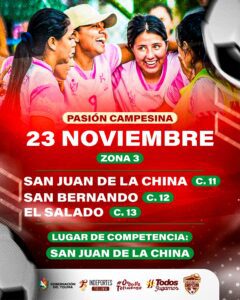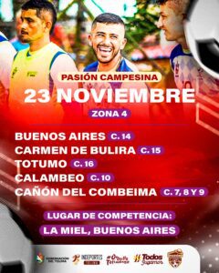 El torneo contará con cuatro sedes donde se disputarán los encuentros el próximo 23 de noviembre: San Juan de la China, Tapias, Coello Cocora y el sector de La Miel (Buenos Aires) serán los escenarios donde se vivirá el talento de los equipos que hacen parte del torneo Pasión Campesina.