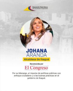 La alcaldesa Johana Aranda ha sido reconocida por la Asociación Colombiana de Ciudades Capitales -Asocapitales- y la Revista El Congreso por su liderazgo, impulso de políticas públicas con enfoque ciudadano, capacidad de innovación y buenas prácticas en el gobierno de Ibagué.