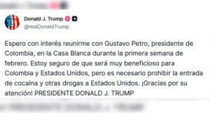 El anuncio fue realizado por el jefe de Estado estadounidense a través de su cuenta oficial en la red social Truth Social, donde señaló que esperaba con interés el encuentro con el presidente de Colombia. Según Trump, la reunión “será muy beneficiosa para Colombia y Estados Unidos”.