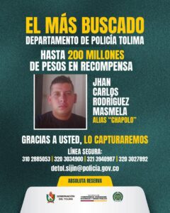 La Gobernación del Tolima ha incrementado los esfuerzos para capturar a Jhan Carlos Rodríguez Masmela, conocido como alias “Chapolo”, considerado uno de los delincuentes más buscados en el sur del departamento.